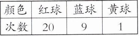 红球可能最多,黄球可能最少。理由:明明摸出红球20次、蓝球9次、黄球1次;亮亮摸出红球18次、蓝球12次、黄球0次。两人摸球中,红球出现次数最多,黄球出现次数最少,在摸球次数足够多的情况下,摸到某种颜色球的次数越多,说明这种颜色球的数量可能越多;反之,次数越少,数量可能越少。