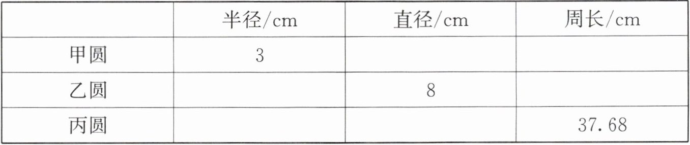 周长:$C = 2\pi r=2×3.14×3 = 18.84(cm)$。