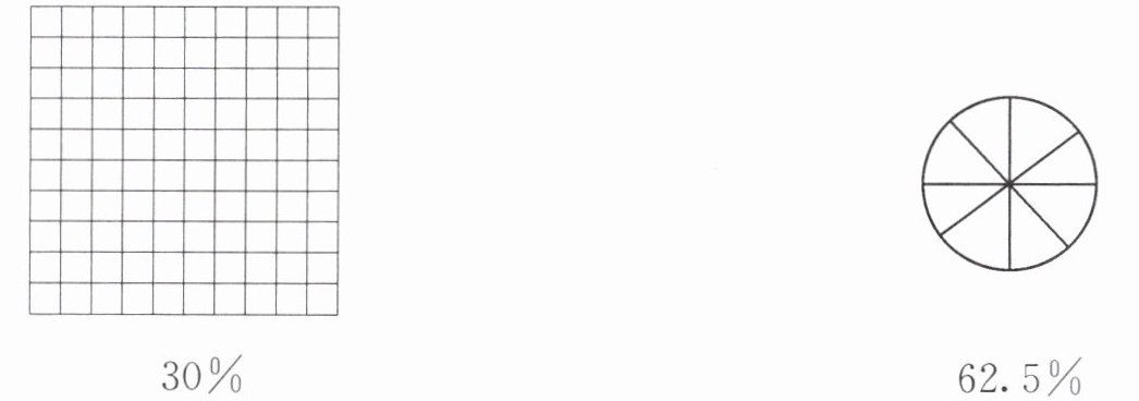 右侧圆形:被平均分成 8 份,$62.5\%=\frac{62.5}{100}=\frac{5}{8}$,所以应给其中 5 份涂阴影。