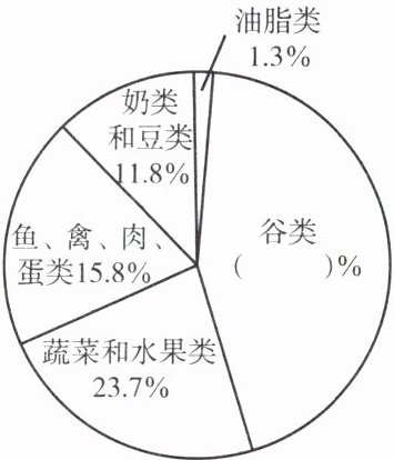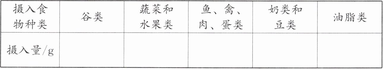 (2) 如果全天的食物摄入量是 1500g,根据扇形统计图计算各类食物的摄入量,填入下表。(可用计算器。)