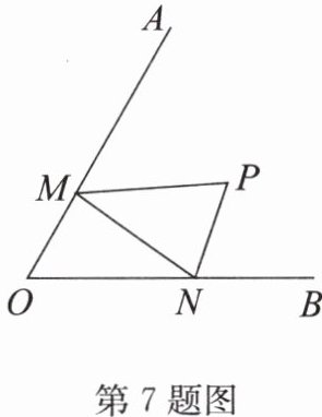 7. 如图,$ \angle AOB = 60° $,点 P 为 $ \angle AOB $ 内一点,点 M,N 分别在 OA,OB 上.当 $ \triangle PMN $ 的周长最小时,$ \angle MPN $ 的度数是