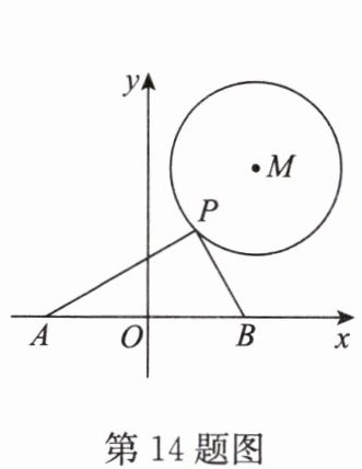 14. 如图,⊙M的半径为4,圆心M的坐标为(6,8),P是⊙M上的任意一点,PA⊥PB,且PA,PB与x轴分别交于A,B两点. 若点A,B关于原点O对称,则AB长的最小值为______.