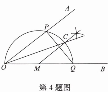 步骤 1:在 $ OB $ 上任取一点 $ M $,以点 $ M $ 为圆心,$ MO $ 长为半径画半圆,分别交 $ OA $,$ OB $ 于点 $ P $,$ Q $;