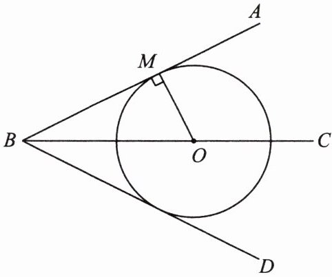 12. 如图,点O为∠ABC的边BC上的一点,过点O作OM⊥AB于点M,以点O为圆心,OM的长为半径作⊙O,将射线BC绕点B顺时针旋转得到射线BD,使得∠CBD+∠MOB= 90°,判断射线BD与⊙O的位置关系,并证明.