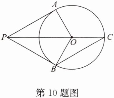 10. 如图,PA,PB是⊙O的切线,切点分别为A,B,PO的延长线交⊙O于点C,连接OA,OB,BC. 若AO= 2,OP= 4,则∠C= ( ).