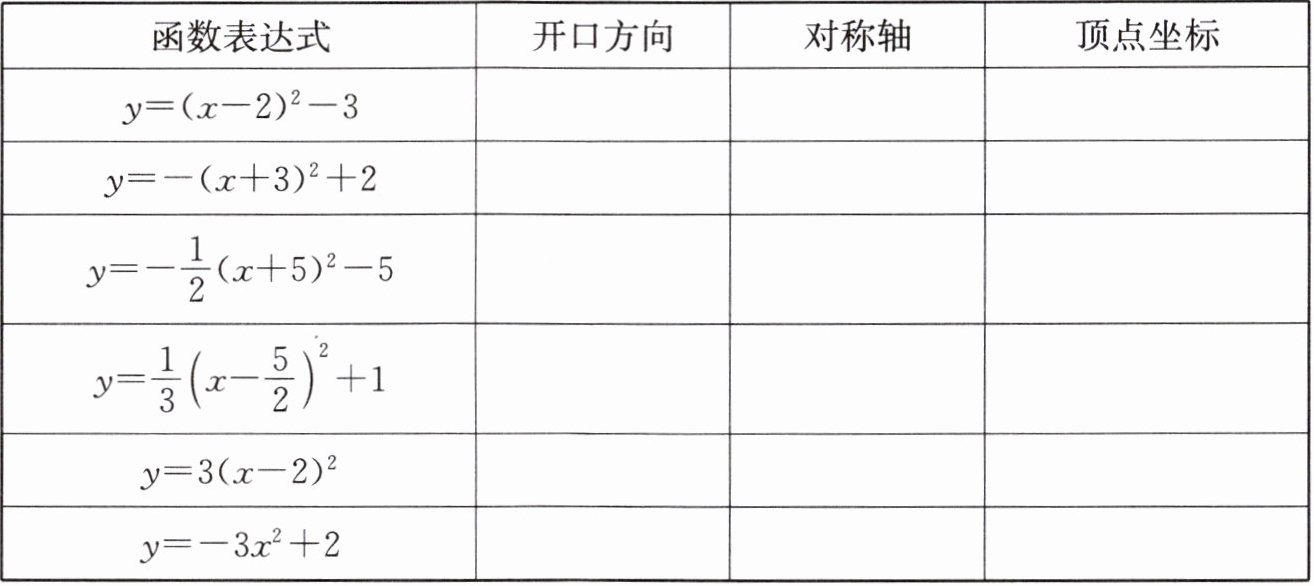 |函数表达式|开口方向|对称轴|顶点坐标|