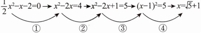 $\frac{1}{2}x^{2}-x-2= 0\xrightarrow{①}x^{2}-2x= 4\xrightarrow{②}x^{2}-2x+1= 5\xrightarrow{③}(x - 1)^{2}= 5\xrightarrow{④}x= \sqrt{5}+1$