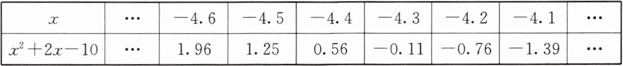 | $x^2 + 2x - 10$ | …$$ | $1.96$ | $1.25$ | $0.56$ | $-0.11$ | $-0.76$ | $-1.39$ | …$$ |