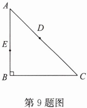 9. 如图,在 $ Rt \triangle ABC $ 中,$ \angle ABC = 90^{\circ} $,$ AB = BC = 3 $,点 $ D $ 在 $ AC $ 上,且 $ AD = 2 $,将点 $ D $ 绕着点 $ A $ 按顺时针方向旋转,使得点 $ D $ 的对应点 $ E $ 恰好落在 $ AB $ 边上,则旋转角的度数为______,连接 $ CE $,$ CE $ 的长为______.
