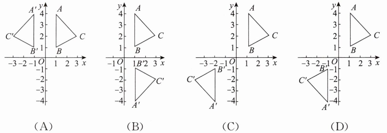 9. 在下列各图中,$\triangle ABC$ 与 $\triangle A'B'C'$ 关于平面直角坐标系 $xOy$ 的原点 $O$ 成中心对称的是( ).