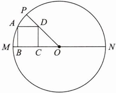 15. 如图,在 $ \odot O $ 中,直径 $ MN = 10 $,正方形 $ ABCD $ 的四个顶点分别在半径 $ OM $,$ OP $ 及 $ \odot O $ 上. 若 $ \angle POM = 45° $,求 $ AB $ 的长.
