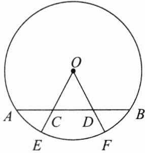 12. 如图,已知⊙O的弦AB,E,F是$\overset{\frown}{AB}$上两点,$\overset{\frown}{AE}= \overset{\frown}{BF}$,OE,OF分别交AB于C,D两点. 求证:AC= BD.