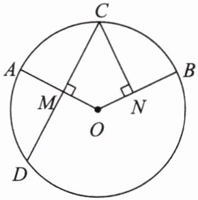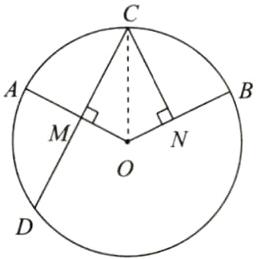 解:连接OC.$\because AO$是半径,$OA\perp CD$,$\therefore CM=\frac{1}{2}CD=2$.$\because C$为$\stackrel{\frown }{AB}$的中点,$\therefore \stackrel{\frown }{AC}=\stackrel{\frown }{BC}$.$\therefore \angle AOC=\angle BOC$.$\because CM\perp OA$,$CN\perp OB$,$\therefore CN=CM=2\ cm$.