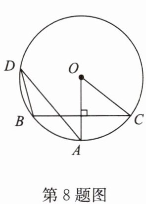 8. 如图,$OA是\odot O$的半径,弦$BC\perp OA$,$D是\odot O$上一点,且点$D在优弧BC$上. 若$\angle ADB = 28^{\circ}$,则$\angle AOC$的度数为( ).