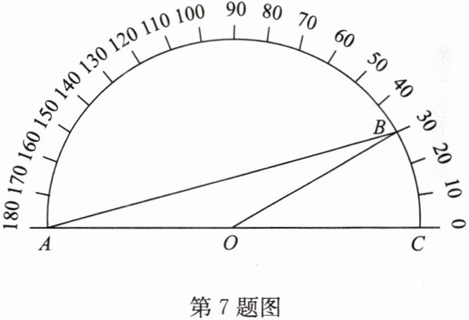 7. 如图,把一个量角器放在$\angle BAC$的上面,请你根据量角器的读数判断$\angle BAC$的度数是( ).