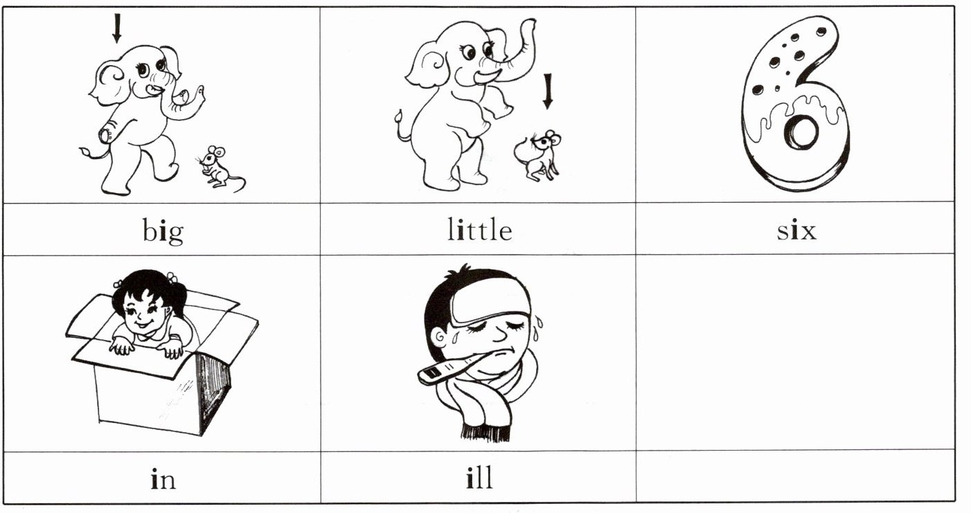 1. 图片显示一头大象和一只老鼠,对应单词“big”(大的)。
