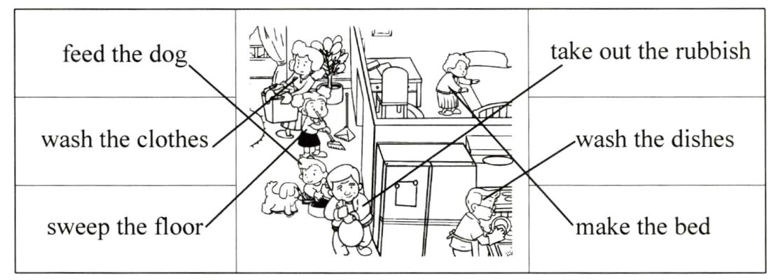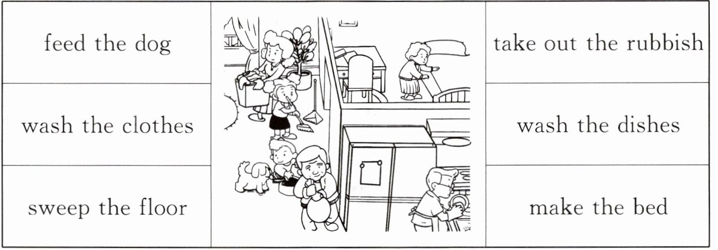 feed the dog take out the rubbish wash the clothes wash the dishes sweep the floor make the bed