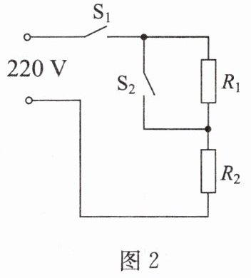 21. 图 1 所示为一种电热紫砂壶,这种壶能自动调节炖汤的“火力”,炖出的汤不仅味道香醇,还可节约能源。图 2 是它的简化电路图,接通电源后防干烧开关 $ S_1 $ 闭合(无水加热超过设定温度时自动断开),当汤的温度达到沸点时,开关 $ S_2 $ 自动断开,维持小火炖煮。$ R_1 = 165 \Omega $ 和 $ R_2 = 55 \Omega $ 均为加热电阻且阻值不随温度改变。