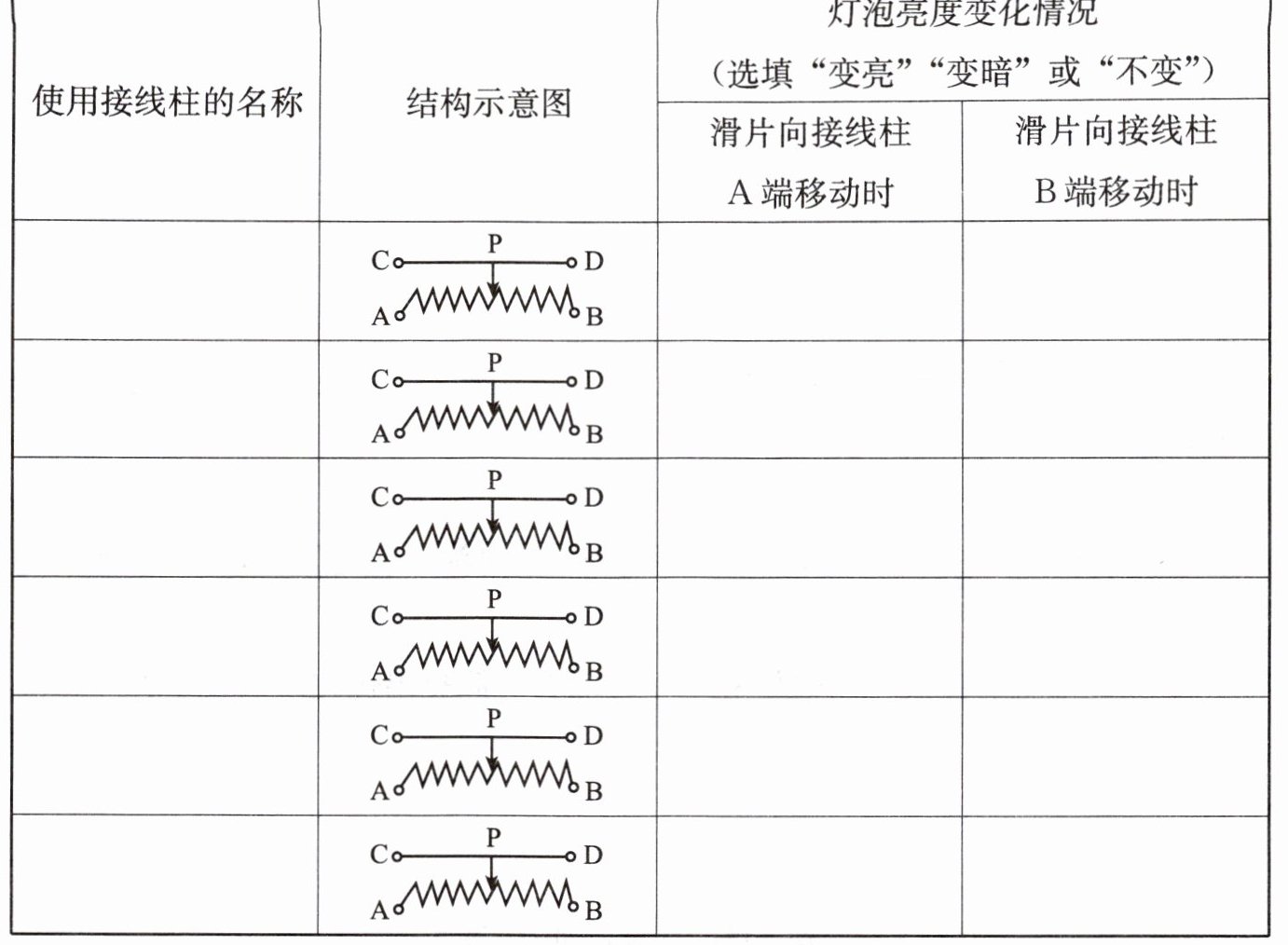|使用接线柱的名称|结构示意图|灯泡亮度变化情况(选填“变亮”“变暗”或“不变”)|