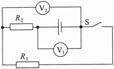 8. 在如图所示的电路中,开关 $ S $ 闭合后,电压表 $ V_1 $ 和 $ V_2 $ 的示数分别为 $ 6 \, V $ 和 $ 4 \, V $,由此可知电阻 $ R_1 $、$ R_2 $ 两端的电压分别是( )