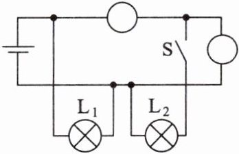 9. 在如图所示的电路中:(1)将电流表、电压表的符号分别填入圆圈中;(2)标出电表的正、负接线柱;(3)标出开关闭合时,通过电路各部分的电流的方向;(4)电流表测的是通过灯泡______的电流;(5)电压表测的是______两端的电压;(6)灯泡 $ L_1 $、$ L_2 $ 是______联。