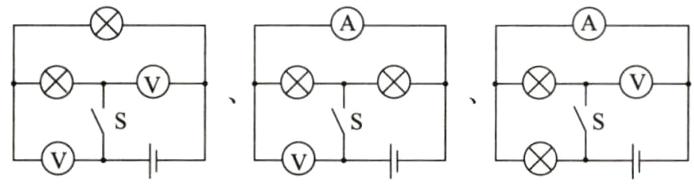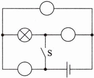11. 如图所示电路中有两个灯泡,请在图中“$ ◯ $”内分别填入电表或灯泡的符号,要求开关闭合时两灯泡均能发光,且两电表的示数均不为零。