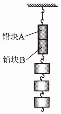 11. 课堂上,老师将两段直径相同的圆柱形铅块A、B的截面磨平后,用力压紧两段铅块,使它们合在一起。接着老师按右图所示的方式把合在一起的铅块挂在铁架台上,并在铅块B下面悬吊几个钩码,两铅块仍未分离。