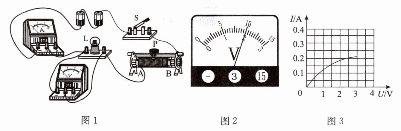 (3)排除故障后,闭合开关,缓慢移动滑动变阻器的滑片 P,同时观察______(选填“电压表”或“电流表”)示数的变化,当电压表的示数如图 2 所示时,其读数为______ $ \mathrm{V} $,若要测得小灯泡正常发光时的电阻,滑片 P 应向接线柱______(选填“A”或“B”)端移动。