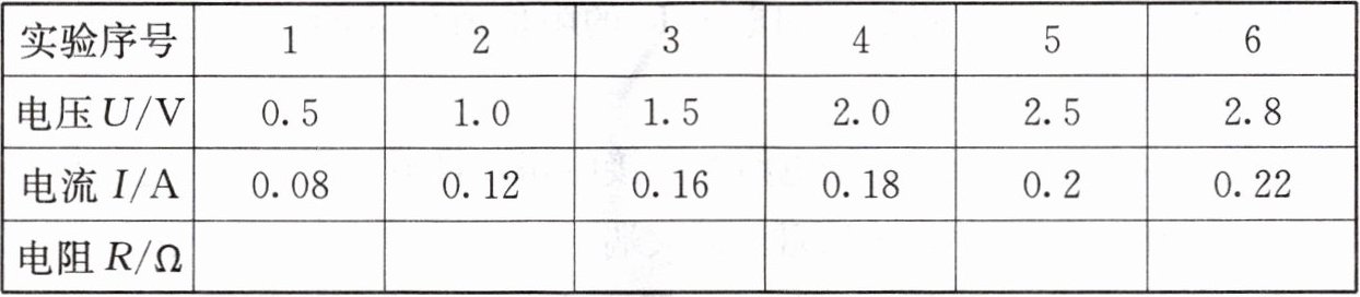 |电压 $ U/\mathrm{V} $|0.5|1.0|1.5|2.0|2.5|2.8|