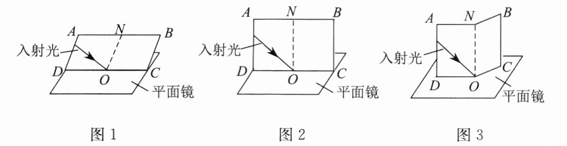 (3)把纸板$ABCD$竖直地立在平面镜上,把纸板$BCON$向后折,使纸板上的直线$ON$仍垂直于平面镜,如图3所示,使一束光贴着纸板$ADON沿某一个角度射到O$点,经平面镜反射,在纸板$BCON$上____(选填“能”或“不能”)看到反射光。经上述实验验证:反射光线在____的平面内。