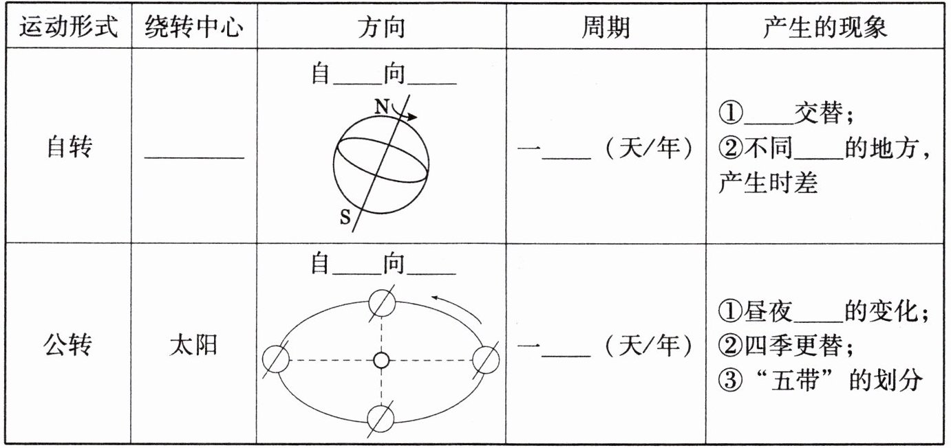 |运动形式|绕转中心|方向|周期|产生的现象|