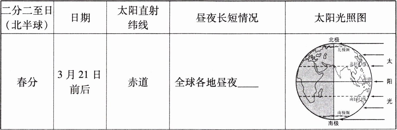 |二分二至日(北半球)|日期|太阳直射纬线|昼夜长短情况|太阳光照图|