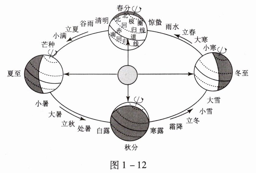 (2)同学们演示地球公转时,保持地轴是倾斜的,且空间指向______(填“变化”或“不变”),让地球仪围绕灯泡按照______方向转动。当地球仪演示到图1-12中夏至日时,太阳直射______(填纬线)。