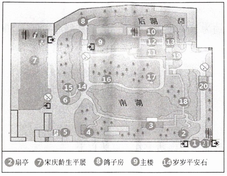 (4)同学们依次参观了扇亭、宋庆龄生平展、鸽子房、主楼、岁岁平安石等地方。请在图 2 - 1 - 5“宋庆龄故居导游图”上用红笔画出他们的参观路线(用线条和箭头表示)。