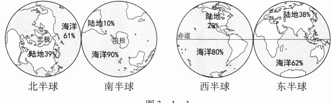 人类对地球海陆面貌的认识,经历了极其漫长的发展过程。直到近代,人类才有了能正确反映地球海陆分布的世界地图。读图3-1-1“地球表面不同半球海陆面积所占比例”,完成第1~4题。