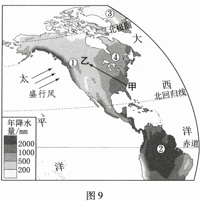 受海陆分布、纬度位置、地形等因素影响,世界各地降水差异很大。读图9“世界局部地区年降水量分布图”,完成第19~21题。