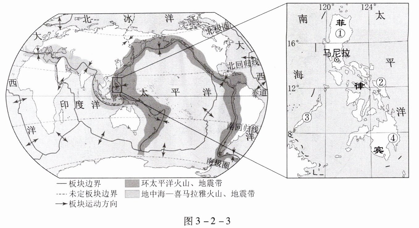 2022 年 7 月 27 日,菲律宾某地(17.70°N,120.55°E)发生 7.0 级地震。图 3 - 2 - 3 为世界板块分布及菲律宾位置示意。读图,完成第 5、6 题。