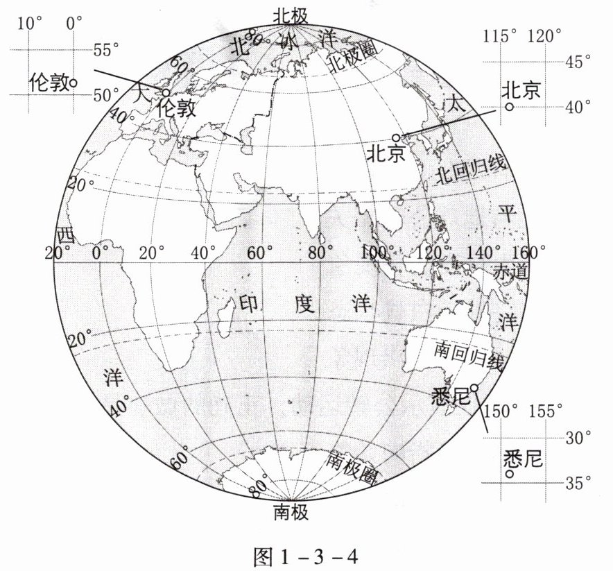 伦敦:纬度___,经度___。悉尼:纬度___,经度___。