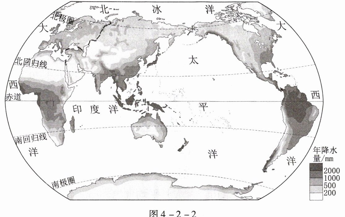 读图4-2-2“世界年降水量分布图”,完成第4、5题。