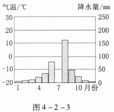1. 表4.2.2为北京市月平均气温和月降水量数据,图4-2-3为北京市气温曲线和降水量柱状图。阅读图表资料,回答下列问题。