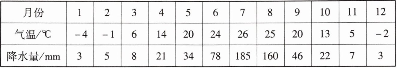 |气温/$^{\circ}C$|-4|-1|6|14|20|24|26|25|20|13|5|-2|