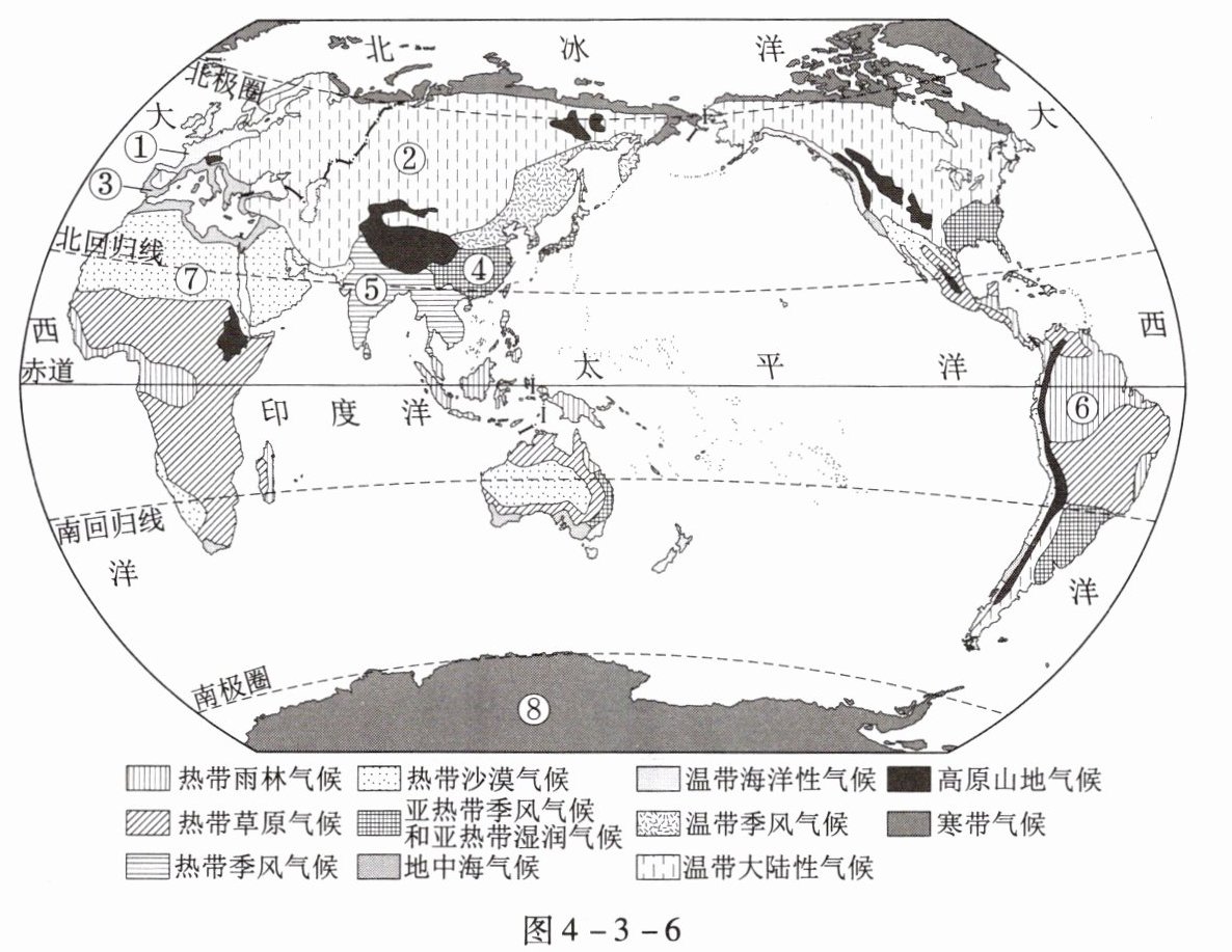 1. 读图 4 - 3 - 6“世界主要气候类型分布图”,回答下列问题。