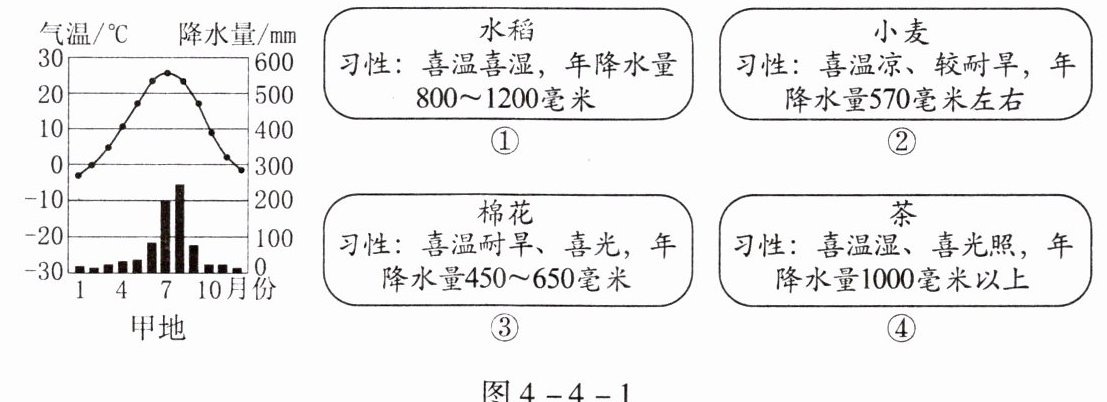 气候是农业发展的重要影响因素。读图4-4-1所示甲地的气温曲线和降水量柱状图及农作物资料,完成第1、2题。