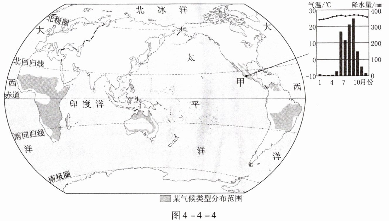 气候对人类的生产生活影响明显,如墨西哥乡间随处可见戴着宽边尖顶大草帽的农民。图4-4-4示意某气候类型的分布和位于墨西哥的甲地的气温曲线和降水量柱状图。据此完成第5~7题。
