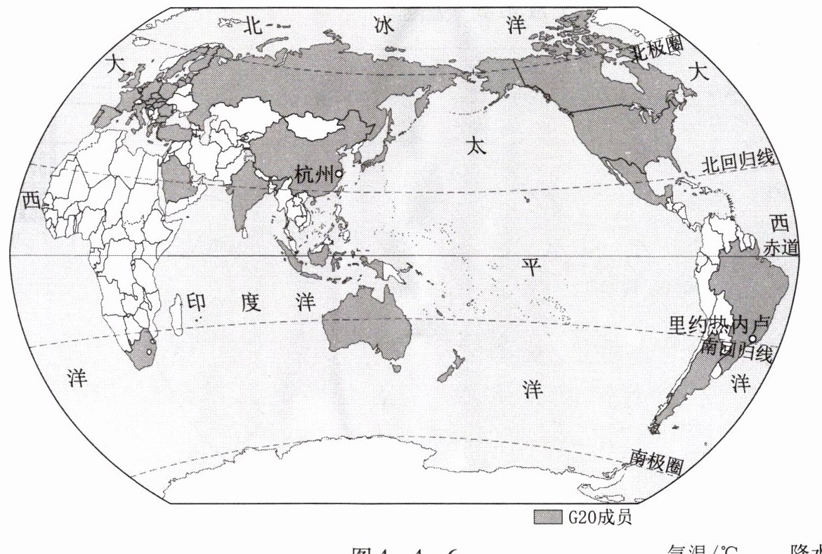 2016年,二十国集团领导人第十一次峰会(即G20峰会)在杭州市举行,2023年,杭州第19届亚运会成功举办,都给全世界留下了难忘的杭州记忆。图4-4-6为G20国家分布图,图4-4-7为杭州气温曲线和降水量柱状图。