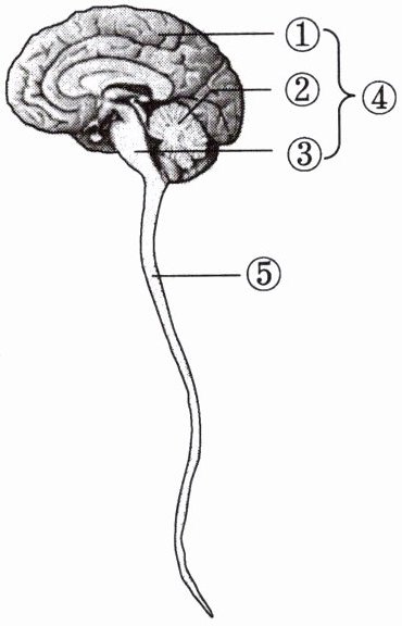 (1)①大脑 神经中枢 语言(2)脑干 ②小脑(3)⑤脊髓(4)脑 中枢 脊神经 ④脑 脑神经