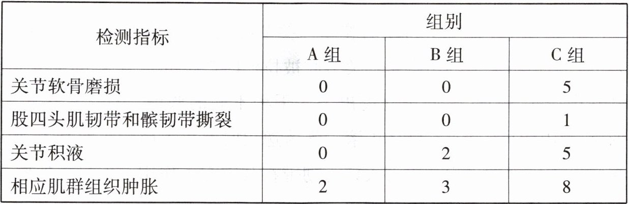 (2)科学骑行要注意控制速度。科研人员将90名普通骑行者随机平均分成A、B、C三组,测试不同骑行速度(A组为20千米/小时,B组为25千米/小时,C组为30千米/小时)对膝关节耐受性的影响。骑行后第2天,对测试者进行检查,结果如下表所示。