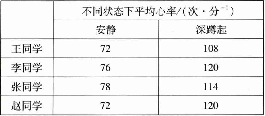 (3)为探究深蹲起运动对心率的影响,四位同学在每次完成30次深蹲起后,及时测量自己的心率,共测量3组。数据如下表所示: