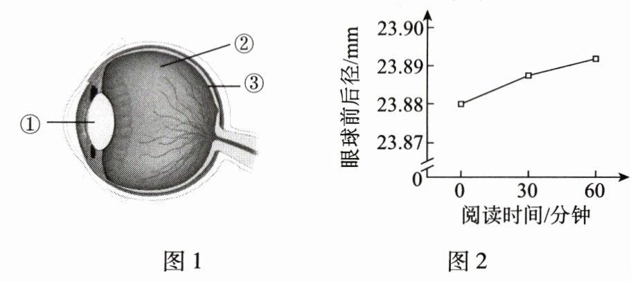 1. 科研人员邀请眼球结构(图1)正常的成年志愿者在弱光下阅读,测定阅读不同时间后眼球前后径,结果如图2。下列叙述