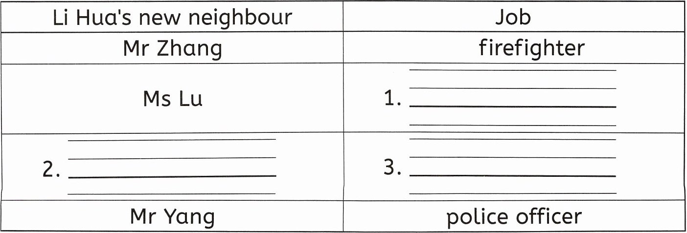 Hello! I'm Li Hua. I have four new neighbours. Mr Zhang is a firefighter. He often helps people. Ms Lu is a cook. She can cook nice food. Mr Chen is a cleaner. He cleans our school. Mr Yang is a police officer. He helps a lot of people. He's great.